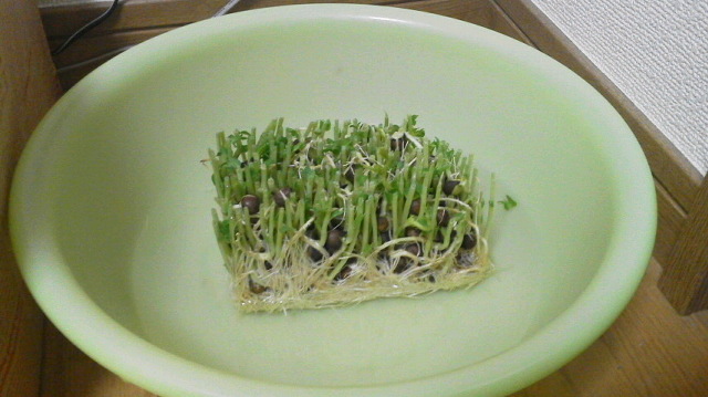部屋の西側の隅っこで Category:未選択 Date:2011年03月01日 豆苗の増殖をはじめました。あ、大丈夫、ほんとに豆苗だから。うん。買った豆苗の根っこを水に浸けとるわけです。一週間から十日くらいで収穫できるらしい。楽しみだなぁ。こういう葉っぱ好きです。かいわれ大根とかみつばとか。調理方法悩むから買うことはあんまりないですけど。明日プレゼンだー!終わればヤマは越える!春休みだが、静岡雑貨屋めぐりとかどうだろって思った。金はかかんなくて時間はそれなりにかかって、なおかつ楽しいことって何だろ。誰か教えて下さい。