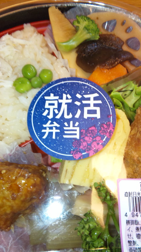 まだ大丈夫です。 Category:未選択 Date:2010年03月25日 携帯のカメラ直ったよ!!という訳で。本日のお昼ご飯、天○屋の「就活弁当」。他にも、婚活弁当(昆布とカツ入り)草食系男子弁当(魚入り)肉食系女子弁当(肉入り)春よ恋(全体的にピンク)いちご美人(いちごスイーツ入り)とか面白い名前のお弁当がありました。ネタ的には婚活弁当か肉食系女子弁当がよかったんですが、就活弁当が普通に美味しそうだったのでそれにしてしまいました。普通に美味しかったです。来年には私も苦しめられるのだろうか…。