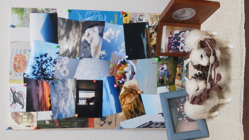 ずっとやりたかったのさ Category:未選択 Date:2011年10月14日 〈材料〉コルクボード画鋲自分で撮ったりもらったりした写真アーティストの名刺フェリシモのおまけのしおりものすごく適当なコラージュを作ってみました。ずっとやりたかったんだよね、写真のコラージュみたいなの。設楽さんに刺激を受けて実行せねばと思った訳です。ちなみに手前にあるのは中・高の部活の写真と、誕生日にお姉ちゃんにもらった羊さんです。羊さんのマフラーは崩れちゃったシュシュです。あと松ぼっくりね。朝早く起きた日にお散歩行って拾ってきました。いやー楽しかった。次はもうちょっと凝ったの作りたいな。
